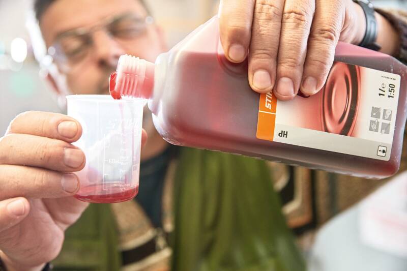 Voor een mengverhouding 1: 50 heb je vijf liter benzine en 0,1 liter of 100 milliliter STIHL tweetaktmotorolie nodig.