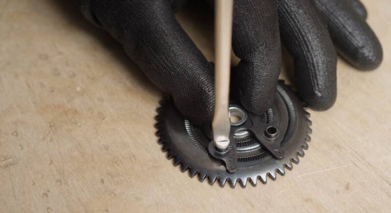 Haal nu het spanwiel eruit en leg het zo neer dat de schroef aan de achterzijde bereikbaar is. Draai de schroef eruit.