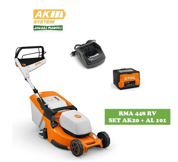 STIHL RMA 448 RV ACCU GRASMAAIER MET ROLAANDRIJVING IN SET MET AK20 ACCU EN AL101 LADER : COMFORTABEL EN EFFICIENT ONDERHOUD VAN MIDDELGROTE GAZONS RONDAM HET HUIS