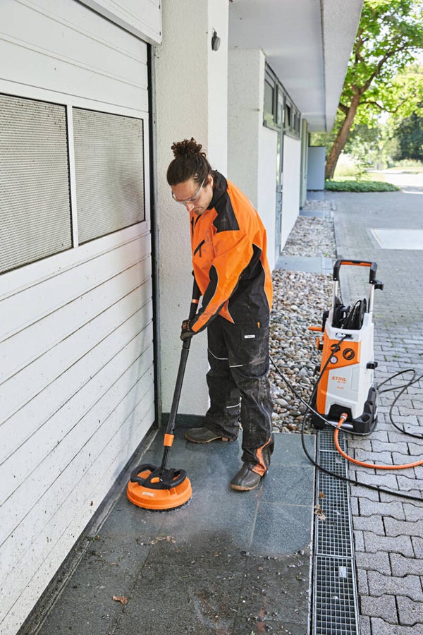 De oppervlaktereiniger heeft een diameter van 255 mm en is ideaal voor het reinigen van bijvoorbeeld uw terras . De robuuste borstelring loopt rond twee roterende vlakstraalsproeiers en maakt zo een spatvrije reiniging van vlakke oppervlakken mogelijk . Door middel van de drukverstelling met behulp van de draaiknop kun je de reinigingsprestatie aanpassen en eenvoudig het gewenste resultaat bereiken. Een extra handgreep van de STIHL oppervlaktereiniger RA 90 maakt een comfortabele bediening mogelijk bij het reinigen van verticale oppervlakken zoals gladde muren.