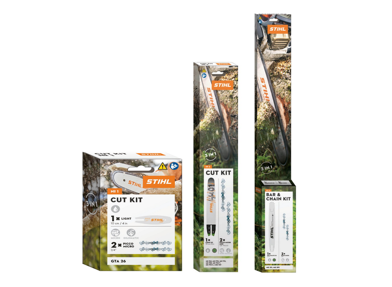 De nieuwe STIHL CUT KITS zijn specifiek voor elke machine samengesteld met telkens 2 zaagkettingen en een zaagblad in een voordeelpaket.